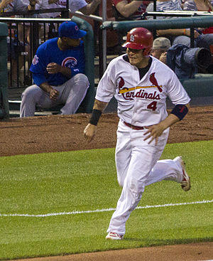Molina's first chance in the Major Leagues arrived when the incumbent catcher, Matheny, went on the disabled list (DL) with a strained rib in the Cardinals' pennant-winning season of 2004. Molina made his Major League debut on June 3.[15] One of his first game-winning hits occurred on August 7. He stroked a broken-bat single to shallow center field in the bottom of the ninth inning against the New York Mets. On the play, the center fielder, Mike Cameron started towards the outfield wall based on Molina's full swing, not immediately realizing that he had made only partial contact because of the broken bat. By the time Cameron charged the ball, it was too late; it fell in for a hit, and Jim Edmonds was able to score.[18] Three weeks later (August 29), the Cardinals were victorious over the Pittsburgh Pirates 6–4 thanks in part to two separate plays in which Molina tagged out the runner at home plate, including a collision with Ty Wigginton.[19]