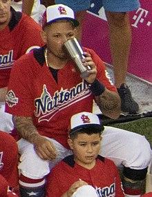On July 7, he was selected to his seventh consecutive All-Star Game, played at Great American Ball Park in Cincinnati.[133] In the Reds' clubhouse for the All-Star Game, Molina shared a locker with Reds' second baseman Brandon Phillips. Since the brawl between the Cardinals and Reds in 2010, the two mended their schism, and Molina has a photograph of their families together.[134] When informed whose locker he was using, Molina replied, "This is Phillips' locker? How about that? I'll have to write something to him."[135] While the pregame roster introductions were made, Reds fans booed all six Cardinals players who were selected, and even former Cardinal Albert Pujols. When Molina was introduced, he smiled and turned and pointed his thumbs toward the back of his jersey. Pujols provided levity when he then joined in the booing. After the game, Molina remarked to reporters, "when you spend 12 years coming to Cincinnati and you beat them so many times, they’re going to boo you." In his career to that point, he hit .319 with a .352 on-base percentage and .500 slugging percentage in 270 career at-bats at Great American Ball Park.[136]