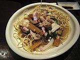 Yakisoba (Japanese: 焼きそば [jakiꜜsoba]), "fried noodle", is a Japanese noodle stir-fry dish. Usually soba means buckwheat, but soba in yakisoba means Chinese noodles (Chuuka soba) made from wheat flour, and are typically flavored with a condiment similar to Worcestershire sauce. The dish first appeared in food stalls in Japan during the post World War II period.[1]