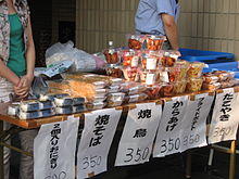 Due to its ease of preparation and portability, yakitori is a very popular street food, often sold from small carts and stalls known as yatai. Yatai are found, among other places, dotting streets during festivals or on heavily trafficked routes during the evening commute where customers enjoy beer and sake with yakitori.[6]
