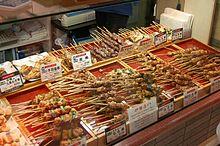 Yakitori (Japanese: 焼き鳥) is a Japanese type of skewered chicken. Its preparation involves skewering the meat with kushi (串), a type of skewer typically made of steel, bamboo, or similar materials. Afterwards, they are grilled over a charcoal fire. During or after cooking, the meat is typically seasoned with tare sauce or salt.[1] The term is sometimes used informally for kushiyaki (grilled and skewered foods) in general.