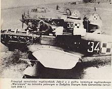 The Yak-1 was well liked by its pilots; Nikolai G. Golodnikov considered that the Yak-1B, flown by experienced pilots, could meet the Bf 109F-4 and G-2 on equal terms.[13][14] The French Normandie-Niemen squadron selected the primitive model Yak-1M (that had a cut-down fuselage to allow all-round vision) when it was formed, in March 1943.[15] Twenty-four of these aircraft were sent to the all-female 586th Fighter Aviation Regiment, whose pilots included the world's only female aces: Katya Budanova, with 5, and Lydia Litvyak (claims range between 5 and 12, plus two shared). Litvyak flew Yak-1 "Yellow 44", with an aerial mast, at first in 296th Fighter Aviation Regiment and then with 73rd Guards Fighter Aviation Regiment, until her death in combat on 1 August 1943.[16] Another ace who flew the Yak-1 was Mikhail Baranov, who scored all his 24 victories with it, including five in a day (four Bf 109s and a Ju 87, on 6 August 1942).[17] The Yak-1 was also the first type operated by the 1 Pułk Lotnictwa Myśliwskiego "Warszawa" (1st Polish Fighter Regiment "Warsaw").