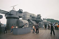 Filming for Yamato took place from March to June 2005 at a closed-down shipyard of Hitachi Zosen Corporation in Onomichi, Hiroshima Prefecture. Approximately JPY 600 million was spent in building a 1:1 scale set of the forward section and the portside anti-aircraft guns. The starboard side, aft section and the barrels of the A turret were not built since the film only required scenes on the port side. However, compliance issues with Japan's Building Standards Act prevented the reproduction of the Yamato's pagoda tower. Instead, photographs of the Yamato Museum's own 1:10 Yamato model was used for post-production.[2] The interior scenes were made on a sound stage, but a hall near the set shows the various rooms and props reproduced for the film.