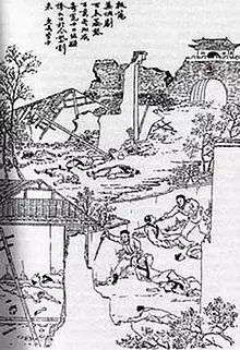 After the fall of Beijing and northern China to the Manchus in 1644, Yangzhou remained under the control of the short-lived Southern Ming based in Nanjing. Qing forces led by Prince Dodo reached Yangzhou in the spring of 1645, and despite the heroic efforts of its chief defender, Shi Kefa, the city fell on May 20, 1645, after a brief siege. The Yangzhou massacre followed; Wang Xiuchu's contemporary account alleged that the number of victims was close to 800,000, but that number is certainly an exaggeration.[22][23] Shi Kefa himself was killed by the Manchus when he refused to switch his allegiance to the Qing regime.[24]