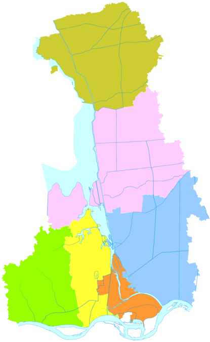 Like much of the entire prefecture-level city, Yangzhou's main urban area (the "city proper") is criss-crossed by an intricate network of canals and small lakes. The historic city center (the former waled city) is surrounded by canals on all sides: the Old Grand Canal forms its eastern and southern boundaries; the City Moat Canal runs along the former walled city's northern edge, connecting the Old Grand Canal with the Slender West Lake; the Erdaohe Canal runs along the old city's western edge, from the Slender West Lake to the Lotus Flower Pond (Hehuachi), which in its turn is connected by the short Erdaogou canal with the Old Grand Canal.[28] It is possible to sail a small water craft from the Thin West Lake, via the Erdaohe, the Hehua Pond, and the Erdaogou into the Old Grand Canal.[29]