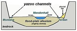 A Yazoo stream (also called a Yazoo tributary[2]) is a geologic and hydrologic term for any tributary stream that runs parallel to, and within the floodplain of a larger river for considerable distance, before eventually joining it. This is especially the characteristic when such a stream is forced to flow along the base of the main river's natural levee.[3] Where the two meet is known as a "belated confluence" or a "deferred junction". The name is derived from an exterminated Native American tribe, the Yazoo Indians.[4] The Choctaw word is translated to "River of Death" because of the strong flows under its bank full stage.[5]