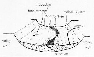 Over time, the main river flows through the landscape, widening a valley and creating a floodplain. Sediment accumulates and creates a natural levee. Tributaries that want to enter the main channel are not allowed because of this levee. Instead, the water then enters the back swamps, or form a yazoo stream.[11] Because yazoo streams are separated from the main river by natural levees, they flow and meander (streams and rivers rarely flow in straight lines) parallel to the main stream channel or river on the floodplain for a considerable distance. These series of smooth bends or curves flows with a slight gradient, and is normally blocked from entering by a natural levee[12] along the larger stream. A yazoo stream will join the major river where it will eventually break through the natural levees and flow into the larger waterway at its belated confluence.