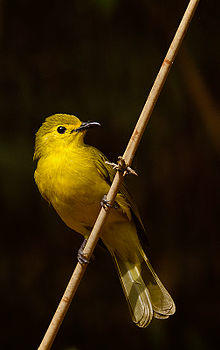 This bulbul is about 20 cm (7.9 in) long, lacks a crest and has the upperparts olive green with a prominent yellow brow and goggle with the underparts being all yellow. The sexes do not differ in plumage. The bill is black and the iris is reddish brown. The population in the northern Western Ghats (ssp. icterica) is paler yellow than the populations further south (ssp. indica). A somewhat disjunct population is found in the Eastern Ghats. Southwestern Sri Lankan populations (ssp. gugliemi) are greener while the northern populations are included in the nominate subspecies.[3][8]