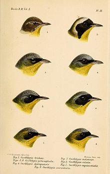 The taxonomy of these closely related species is complicated, and it is sometimes difficult to define which forms merit species status. For example common yellowthroat, Belding's yellowthroat, Altamira yellowthroat, and Bahama yellowthroat are sometimes considered conspecific. Conversely masked yellowthroat can be split to three or even four species. The name 'yellowthroat' is sometimes used as an alternate name for the yellow-throated leaflove.[1]