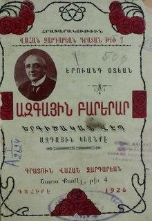 Yervant Odian (Armenian: Երուանդ Օտեան or Երվանդ Օտյան) (Constantinople, Turkey, 19 September 1869 – Egypt 1926)[1] more known by his satire name "Comrade Panchooni" (Panchooni translating to 'one who has nothing[2]),[3] is considered to be one of the most influential Armenian satirists, along with the roughly contemporary Hagop Baronian. Odian was born into one of the most affluent families in what was then Constantinople (now modern day Istanbul).[2] His Paternal Uncle Krikor Odian (1834-1887) was a respected political figure and was even one of the founders and writers of the Armenian National Constitution.[2] His father too was a writer, along with having been a political diplomat and possibly most unique of all, a translator of Victor Hugo's.[2] Odian's mother was indeed wealthy on her side of the family as well.[2] Odian's writings, which include novels and short stories, often humorously point out humanity's vices. Odian's heritage played a major role in some of his major themes, those being Armenian-Turkish relations as well as Muslim-Christian relations.[4] Interestingly enough, Odian's grandfather Yazedje Boghos Agha was from Palu, Turkey, a town notable for its massive Armenian population, a major part of its destruction during the Armenian massacre events of the 1894-1896.[5] He had the unique ability to conceive of and write stories at any given instant. In a 2013 piece written by Eddie Arnavoudian, he proclaimed "Even if elsewhere equalled in modern Armenian literature, Odian's exposure of the establishment's putrid core has certainly not been bettered".[3] Odian's writing styles are often described as extroverted, as if his is removing his persona from the piece in order to best portray the truth.[2] Though Odian was surrounded by nearly all of the other great Armenian writers of his time, and friendly with many of them, their writing styles never altered his own, always staying true to his voice.[2]