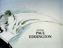 The opening titles were drawn by artist and cartoonist Gerald Scarfe, who provided distinctive caricatures of Eddington, Hawthorne and Fowlds in their respective roles to represent distortion.[8] He animated them as 'self-drawing' by positioning the camera above his paper, adding parts of lines, and then photographing two frames at a time. The sequence ended with the title of the episode superimposed on a facsimile of an edition of the House of Commons Weekly Information Bulletin. Curiously, the legend Compiled in the Public Information Office of the House of Commons Library was left in the sequence. Scarfe created a second set of graphics for Yes, Prime Minister, including a different title card for each episode. Derek Fowlds wanted to buy an original drawing but was unable to afford it.[8] The series' performance credits typically only featured those of the actors who appeared in the particular episode, not the names of characters. The typeface used in the credits is Plantin, a common typeface used in the British press at the time. The show title is set in bold condensed and the credits are in bold.