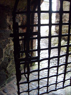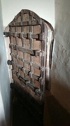 The yett was frequently used as cheaper alternative to the portcullis,[12] since it was simpler in concept, less cumbersome and more practical.[7] However, it was also used within more complex defensive arrangements. The 14th-century castle at Doune, in Perthshire, had a portcullis in the main gateway supplemented by a yett, with a second yett at the far bailey end of the passage. The yetts each had two leaves, with a wicket gate inserted within one of the leaves.[13] Commonly, the yett would be placed behind a wooden door, providing additional security should the outer door be burned.[14]