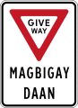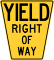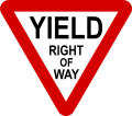 In road transport, a yield or give way sign indicates that merging drivers must prepare to stop if necessary to let a driver on another approach proceed. A driver who stops or slows down to let another vehicle through has yielded the right of way to that vehicle. In contrast, a stop sign requires each driver to stop completely before proceeding, whether or not other traffic is present. Particular regulations regarding appearance, installation, and compliance with the signs vary by some jurisdiction.