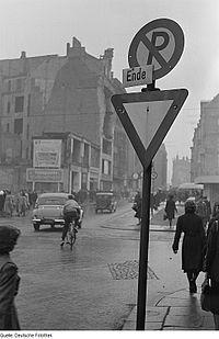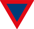 A black triangle (within the standard down-arrow-shape of stop signs) was a symbol of "stop for all vehicles" from about 1925 in Germany. The triangular yield sign was used as early as 1938 when it was codified in Czechoslovakia in a blue-white variant without words[1] and in 1939 in the Protectorate of Bohemia and Moravia which adopted the current red-white variant.[2] In the United States, the first yield sign was erected in 1950 in Tulsa, Oklahoma, designed by Tulsa police officer Clinton Riggs;[3] [4][5] Riggs invented only the sign, not the rule, which was already in place.[6] Riggs' original design was shaped like a keystone; later versions bore the shape of an inverted equilateral triangle in common use today.
