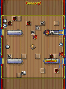 - Gunnery is similar to direction puzzles such as ChuChu Rocket!. The puzzle board is a ship's deck with four cannons. Blocks representing gunpowder, wadding, cannonballs and buckets of water move around the main deck. The player must place these blocks in the cannon in the correct order: gunpowder first, wadding second, cannonball last. This is done by placing arrows that further force pieces to go in certain directions. Water buckets clear out a cannon, and are necessary to clear a cannon that has been mis-loaded, or clean a cannon that has just been fired. When a cannon is fully loaded, the captain may fire it during battle. This puzzle can only be played by members of a crew at or above the rank of Pirate, unless given special permission by an officer.