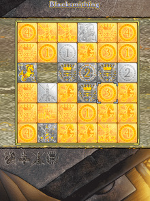 - Blacksmithing, derived from logic mazes, creates swords and cannonballs. The objective is to try to clear the board by hammering the pieces. It was born from a player created puzzle project named Knightfish as part of a Grand Crafting Puzzle Project. There are nine pieces - numbers 1 to 4, chess pieces (knight, bishop, rook and queen), as well as the rum jug, a wild piece. Each piece can be hit 3 times before it disappears; it may or may not change type upon being hit. Each piece changes color each time it is hit. Rum jugs are only awarded after every piece has been hit once (or more), and after every piece has been hit twice (or more). When hitting a number, the next hit must be that many squares away (horizontal, vertical or diagonal). When hitting a chess piece, the next hit must be able to be reached by that chess piece (according to its movement in chess). Except for the knight, it must also be on the border of the board. The rum jug, when hit, enables the player to play anywhere. Points are scored by chains of the same piece type played in a row, and more so by alternating sets of each of the four numbers (or chess pieces), then the chess pieces (or numbers). When no more moves are available, points are also scored dependent on how many strikes have been made (out of the maximum 108.)