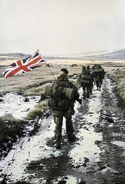 The most famous yomp of recent times was during the 1982 Falklands War. After disembarking from ships at San Carlos on East Falkland, on 21 May 1982, Royal Marines and members of the Parachute Regiment yomped (and tabbed) with their equipment across the islands, covering 56 miles (90 km)[2] in three days carrying 80-pound (36 kg)[3] loads. They were supposed to be transported by helicopters, but after the Atlantic Conveyor, which carried the helicopters, was sunk by Argentinian Exocet missiles on 25 May, the soldiers had to march on land.