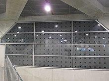 Engineering Consultants Arup and Architecture firm Foster+Partners designed the station, which has a boomerang shape with entrances at the north and south ends of the structure. The north entrance contains stairs and escalators down to the concourse level and then more stairs to the fare gates. Besides stairs, the south entrance provides a barrier-free route consisting of an elevator to the concourse level plus a ramp to the fare gates.[11] Natural light flows through the concourse down to the platform level.[12] The station has a metal cool roof to reflect heat from sun rays.[13] Jason Bruges Studio provided the station artwork titled "Piston Effect" consisting of a series of glass panels on the west walls at concourse and above the northbound trainway. Behind the panels are liquid crystal displays (LCDs) that detect the passage of a train and then produce a lighting display in various tones of black and white.[14][15]