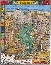 James Hutchings—who organized the first tourist party to the Valley in 1855—and artist Thomas Ayers generated much of the earliest publicity about Yosemite, creating articles and entire magazine issues about the Valley.[19] Ayres' highly detailed angularly exaggerated artwork and his written accounts were distributed nationally and an art exhibition of his drawings was held in New York City.