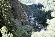 Tenaya Creek flows southwest from Tenaya Lake and down Tenaya Canyon, finally flowing between Half Dome and North Dome before joining the Merced River. The following falls tumble from the Valley rim to join it at various points: