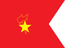 The Pioneer Battalion flag is 90 x 120 cm, while the flag of each Company is 60 x 80 cm, with an isosceles triangle (60 x 20 cm) removed from the right side. The removed triangle corresponds to the red scarf worn by Young Pioneers.