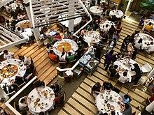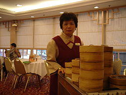 The traditional methods of serving dim sum include using trays strung around servers' necks or using push carts.[5] The teoi ce (推車, "push-cart") method of serving dim sum, dates back to the early 1960s and includes dim sum items cooked in advance, placed into steamer baskets, and brought out on push carts into the dining area.[18][19] Employees call out the items they are serving, customers notify the server about the items they would like to order, and the server places the desired items on the table.[4] The general yum cha atmosphere is a loud, festive one due to the servers calling out the dishes and the groups of diners having conversations.[20]