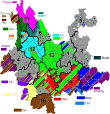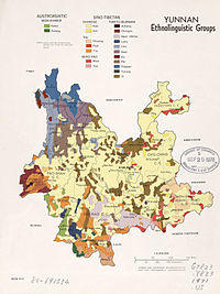 From the Yuan dynasty onward, the area was part of a central-government sponsored population movement towards the southwestern frontier, with two major waves of migrants arriving from Han-majority areas in northern and southeast China.[7] As with other parts of China's southwest, Japanese occupation in the north during World War II forced another migration of Han people into the region. These two waves of migration contributed to Yunnan being one of the most ethnically diverse provinces of China, with ethnic minorities accounting for about 34 percent of its total population.[8] Major ethnic groups include Yi, Bai, Hani, Zhuang, Dai and Miao.[9] Yunnan Province has also been identified as "the birthplace of tea...the first area where humans figured out that eating tea leaves or brewing a cup could be pleasant."[10]