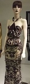 The eponymous brand was founded in 1961 by designer Yves Saint Laurent and his partner, Pierre Bergé, and the current logos were designed in 1963 by A. M. Cassandre.[8] During the 1960s and 1970s, the firm popularized fashion trends such as the beatnik look, safari jackets for men and women, tight pants and tall, thigh-high boots, including the creation of arguably the most famous classic tuxedo suit for women in 1966, Le Smoking suit. Some of his most memorable collections include the Pop Art, Ballet Russes, Picasso, and Chinese ones. He also started mainstreaming the idea of wearing silhouettes from the 1920s, 1930s and 1940s. He was the first, in 1966, to popularize ready-to-wear in an attempt to democratize fashion, with Rive Gauche and a boutique of the same name.[9] Among Saint Laurent's muses were Loulou de La Falaise, the daughter of a French marquis and an Anglo-Irish fashion model; Betty Catroux, the half-Brazilian daughter of an American diplomat and wife of a French decorator; Talitha Pol-Getty, a model and actress whose husband was a Getty heir; and Catherine Deneuve, the French actress.
