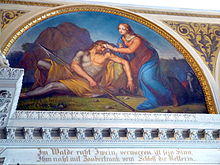 Iwein (Yvain) is cured of madness in a 1851 German fresco at the Schwerin Castle in Mecklenburg