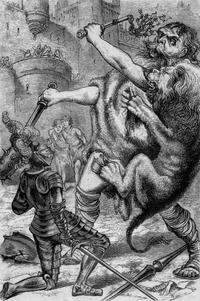 Yvain's lion coming to his aid against a giant in an illustration for Ascott R. Hope's The Old Tales of Chivalry, Re-told (1877)