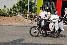A zémidjan (or zem) is a type of taxi found in Benin, West Africa.[1] The highest concentration is found in the largest city, Cotonou, where there are an estimated 72,000.[2] Zémidjans are motorcycles that carry one to two passengers for short distances in towns. The fares are entirely negotiable. The drivers wear uniforms that are color-coded by city and have registration numbers on the back. The name derives from the Fon language where zémidjan means "get me there fast" or "take me quickly".[1][3]
