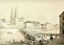 Led by Bernhard Hirzel, pastor of Pfäffikon, several thousand putschists stormed the city from the west, and fought the cantonal troops in the alleys between Paradeplatz and Fraumünster. Botanist and councillor Johannes Jacob Hegetschweiler was shot in the head as he was acting as a mediator between the city's council and the insurgents. He died three days later.[1][2][3]
