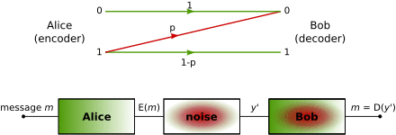 A Z-channel is a channel with binary input and binary output, where each 0 bit is transmitted correctly, but each 1 bit has probability p of being transmitted incorrectly as a 0, and probability 1–p of being transmitted correctly as a 1. In other words, if X and Y are the random variables describing the probability distributions of the input and the output of the channel, respectively, then the crossovers of the channel are characterized by the conditional probabilities:[1]
