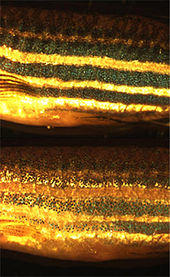 In 1999, the nacre mutation was identified in the zebrafish ortholog of the mammalian MITF transcription factor.[76] Mutations in human MITF result in eye defects and loss of pigment, a type of Waardenburg Syndrome. In December 2005, a study of the golden strain identified the gene responsible for its unusual pigmentation as SLC24A5, a solute carrier that appeared to be required for melanin production, and confirmed its function with a Morpholino knockdown. The orthologous gene was then characterized in humans and a one base pair difference was found to strongly segregate fair-skinned Europeans and dark-skinned Africans.[77] Zebrafish with the nacre mutation have since been bred with fish with a roy orbison (roy) mutation to make fish that have no melanophores or iridophores, and are transparent into adulthood. These fish are characterized by uniformly pigmented eyes and translucent skin.[6]