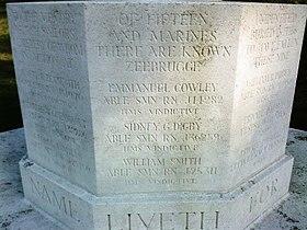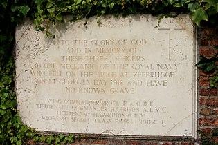 On 23 April 1964, some of the 46 survivors of the raid, families, the Mayor of Deal and a large Royal Marines honour guard held a service of commemoration for their fallen comrades at the Royal Marines barracks in Deal; a tree was planted near the officers' quarters in remembrance. A message from Winston Churchill to the ex-servicemen was read to those assembled and the event was reported in The Deal, Walmer and Sandwich Mercury newspaper on 23 and 30 April 1964.[40][41] In Dover there are two memorials, the Zeebrugge Bell with memorial plaque in the Town Hall, given to Dover by the King of the Belgians in 1918 and the Zeebrugge Memorial in St James's Cemetery, where a regular memorial service is held.[42]