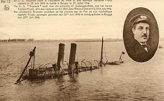 The attempt to sink three old cruisers to block the flow of traffic in and out of the Port of Bruges-Zeebrugge failed. The failure of the attack on the Zeebrugge mole resulted in the Germans concentrating their fire on the three blocking ships, HMS Thetis, Intrepid and Iphigenia, which were filled with concrete. Thetis did not make it to the canal entrance, after it hit an obstruction and was scuttled prematurely. The two other ships were sunk at the narrowest point of the canal.[23] The submarines C1 (Lieutenant A. C. Newbold) and C3 were old, manned by volunteer crews of one other officer and four ratings. They had five tons of amatol packed into their fore-ends and were to be driven into the viaduct and then blown up, to prevent reinforcement of the German garrison on the mole.[24] The crews were to abandon their submarines shortly before the collision with the viaduct, leaving the submarines to steer themselves automatically. During the passage from Dover, C1 parted with its tow and arrived too late to take part in the operation.[25][e] Sandford elected to steer C3 into the viaduct manually instead of depending on the automatic system.[27]