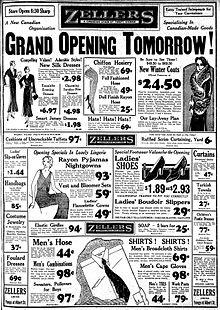 - ^ London Free Press August 3rd, 1928 edition, http://torontoist.com/2015/01/vintage-toronto-ads-zellers/ & http://www.hbcheritage.ca/…/hist…/people/builders/zeller.asp
