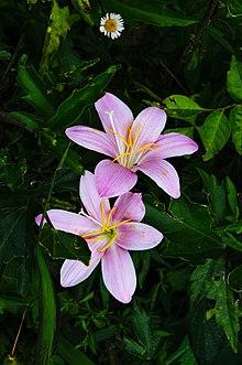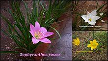 Zephyranthes /ˌzɛfɪˈrænθiːz/[3] is a genus of temperate and tropical plants in the Amaryllis family, subfamily Amaryllidoideae,[4] native to the Western Hemisphere and widely cultivated as ornamentals. There are over 70 recognized species,[5] as well as numerous hybrids and cultivars. Common names for species in this genus include fairy lily, rainflower, zephyr lily, magic lily, Atamasco lily, and rain lily.