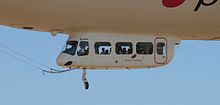 The base model of the Zeppelin NT has a passenger capacity of 12 in addition to a crew of two; alternatively, it is capable of lifting payloads of up to 1,900 kg (4,200 lb). In contrast, the original Zeppelin designs carried over a hundred passengers and crew, with a nearly even ratio of passengers to crew members.[22] The Zeppelin NT has been equipped with a variable cabin structure, allowing it to be quickly changed for various purposes and missions.[10] Entrance and egress of the cabin for both cargo and passengers is provided by a pair of large hinged floor-level doors.[20] In a passenger configuration, up to 13 seats equipped with seatbelts may be installed along with heating/air conditioning systems, a kitchenette, and a restroom in the rear cabin area; large wraparound windows are also present to provide panoramic views of the outside.[9][23] Amongst the possible seating configurations, more luxurious VIP layouts are also available. Alternatively, mission equipment can be installed in the cabin area.[24]