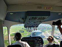 The two-man cockpit of the Zeppelin NT is equipped with modern avionics systems and provides similar levels of external visibility to that of a helicopter. The flight controls make use of fly-by-wire technology to reduce physical demands upon the pilot as well as enable the execution of precision maneuvers; the pilot uses a single joystick to steer the airship across the three dimensions.[10][19] The Zeppelin NT is certified for single pilot operations, the second seat is often used by a flight attendant during tourist operations.[20] Elements of the airship's avionics, including navigation, communication, and air data systems, can be directly interfaced with the mission support systems; an 8kVA additional electrical power system is also present.[13] In early 2012, ZLT and Goodyear signed an agreement to replace the Zeppelin NT's instrumentation and display systems, upgrading the cockpit to feature a glass cockpit.[21]