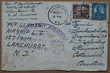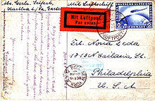 Zeppelin mail was mail carried on zeppelins, the German airships that saw civilian use from 1908 to 1939. Almost every zeppelin flight carried mail, sometimes in large quantities; the covers usually received special postmarks, and a number of nations issued postage stamps specifically intended for use on mail carried by the zeppelins.