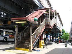 It resembles other elevated stations along the line: it has wood mezzanines and no windscreens along the platform edges.