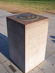 In his plan for Washington, Pierre (Peter) Charles L'Enfant intended a column to be placed 1 mile (1.6 km) east of the Capitol, of which is now Lincoln Park, "from which all distances of places through the continent were to be calculated."[5] Instead, in 1804, the Jefferson Stone or Jefferson Pier was placed on the meridian of the White House due west of the Capitol (390 feet (119 m) WNW of the center of the Washington Monument) to mark the Washington meridian, 77° 02' 11.56".