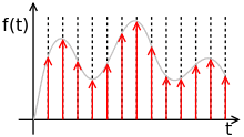The scaling by , which arises naturally by time-scaling the delta function, has the result that the mean value of xs(t) is equal to the mean value of the samples, so that the lowpass filter needed will have a DC gain of 1. Some authors use this scaling,[1] while many others omit the time-scaling and the T, resulting in a low-pass filter model with a DC gain of T, and hence dependent on the units of measurement of time.