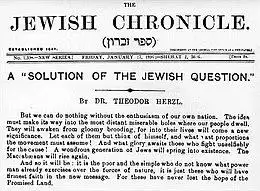 Throughout the first decade of the Zionist movement, there were several instances where Zionist figures supported a Jewish state in places outside Palestine, such as Uganda and Argentina.[60] Even Theodor Herzl, the founder of political Zionism was initially content with any Jewish self-governed state.[61] However, other Zionists emphasized the memory, emotion and myth linking Jews to the Land of Israel.[62] Despite using Zion as the name of the movement (a name after the Jebusite fortress in Jerusalem, which became synonymous with Jerusalem), Palestine only became Herzl's main focus after his Zionist manifesto 'Judenstaat' was published in 1896, but even then he was hesitant.[63]