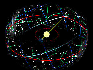 Astronomically, the zodiac defines a belt of space extending 9° either side of the ecliptic, within which the orbits of the Moon and the principal planets remain.[62] It is a feature of a celestial coordinate system centered upon the ecliptic, (the plane of the Earth's orbit and the Sun's apparent path), by which celestial longitude is measured in degrees east of the vernal equinox (the ascending intersection of the ecliptic and equator).[63] Stars within the zodiac are subject to occultations by the Moon and other solar system bodies. These events can be useful, for example, to estimate the cross-sectional dimensions of a minor planet, or check a star for a close companion.[64]