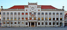 Its nine churches include the Gothic church of St. Mary (1451–1536), with a spire 285 ft (87 m) high and a bell weighing 51 tons. The church contains an altar with wood carvings, eight paintings by Michael Wohlgemuth and a pietà in carved and painted wood by Peter Breuer.