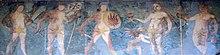 The western clock face has similar hands, but is an integral part of Victor Surbek's 1929 fresco "Beginning of Time". The painting depicts Chronos swooping down with cape fluttering, and, below the clockface, Adam and Eve's eviction from Paradise by an angel.[24]