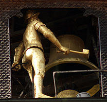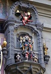 When the great bell rings out every full hour, struck by a large clockwork-operated hammer, passers-by see a gilded figure in full harness moving its arm to strike it. The larger-than-life figure of bearded Chronos, the Greek personification of time, is traditionally nicknamed Hans von Thann by the Bernese.[20] The wooden bell-striker, which has been replaced several times, has been a fixture of the Zytglogge since the renewal of the astronomical clock in 1530, whose clockwork also controls the figure's motions. The original wooden Chronos might have been created by master craftsman Albrecht von Nürnberg,[21] while the current and most recent Hans is a 1930 reconstruction of a Baroque original. The bell-striker has been gilded, just like the bells, since 1770.[18]