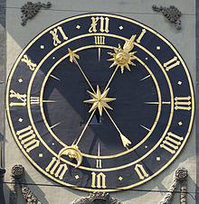 Around the planisphere moves the rete, a web-like metal cutout representing the zodiac, which also features a Julian calendar dial. Above the rete, a display indicates the day of the week. Because leap days are not supported by the clockwork, the calendar hand has to be reset manually each leap year on 29 February.[12] A moon dial circles the inner ring of the zodiac, displaying the moon phase. The principal hand of the clock indicates the time of day on the outer ring of 24 golden Roman numerals, which run twice from I to XII. It features two suns, the smaller one indicating the date on the rete's calendar dial. The larger one circles the zodiac at one revolution per year and also rotates across the planisphere once per day. Its crossing of the horizon and dawn lines twice per day allows the timing of sunrise, dawn, dusk and sunset.[26]
